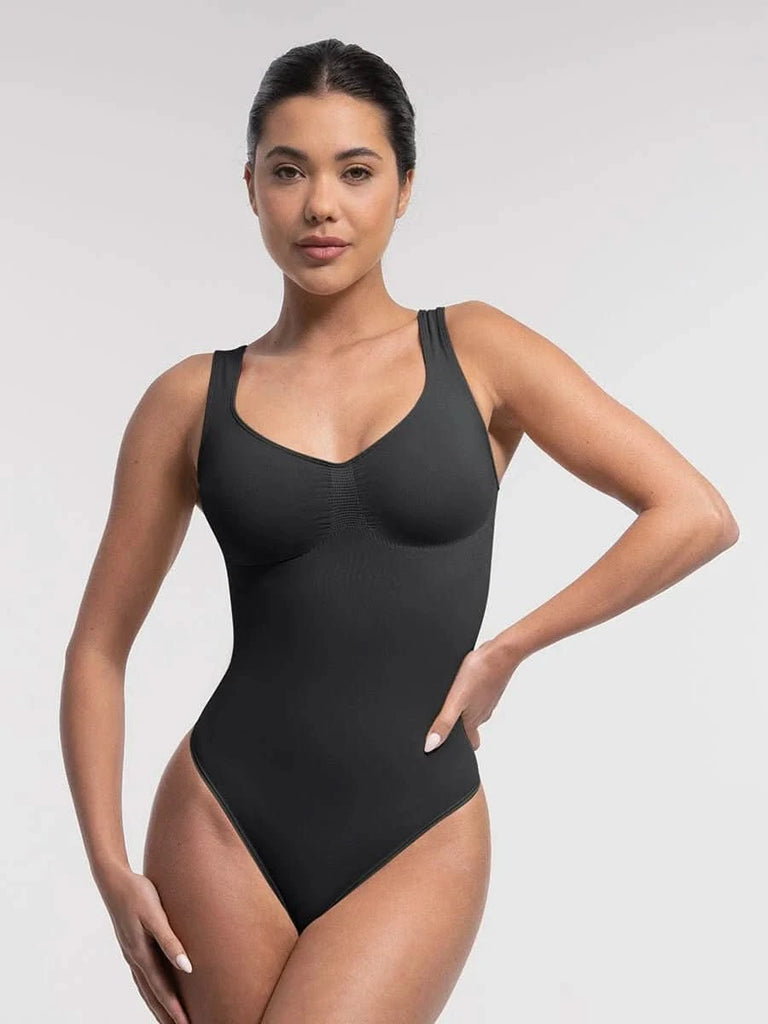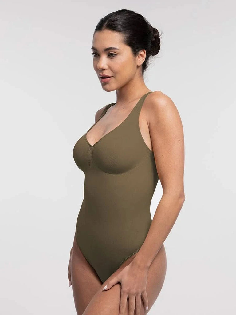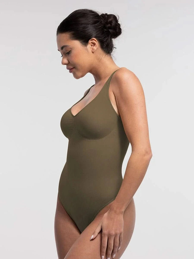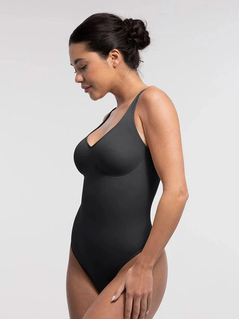 Designed to flatter from every angle, this seamless thong bodysuit features a sculpting diamond neckline, ruched bust support, and gentle tummy control — all with an invisible finish under your favorite outfits.